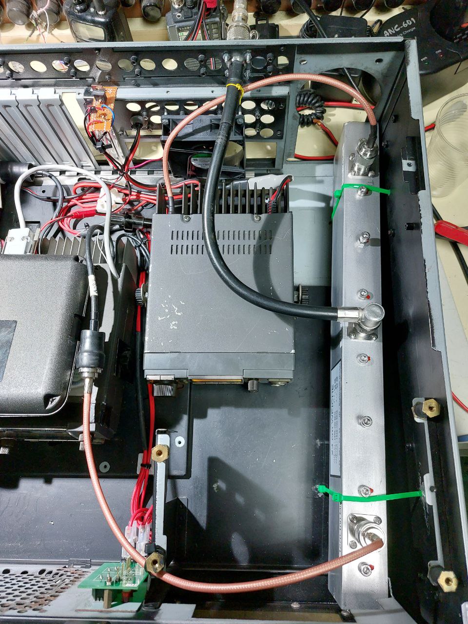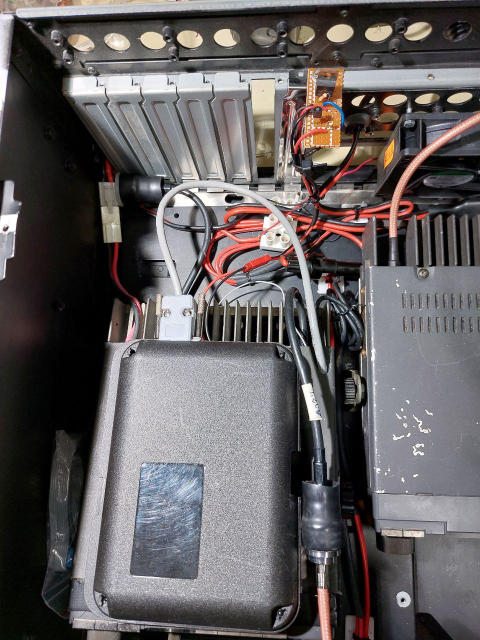 Detalle de la caja abierta por el frontal, donde se aprecia el equipo de tx ICOM IC-1201 y a su derecha la cavidad resonante.